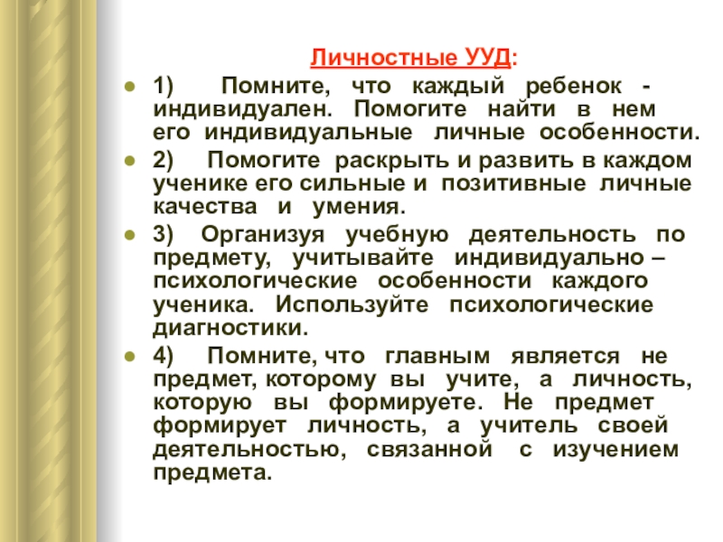 4) Помните, что главным является не предмет, которому вы учите, а личность, которую вы формируете. Не предмет формирует личность, а учитель своей деятельностью, связанной с изучением предмета.