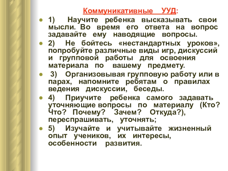 4) Приучите ребенка самого задавать уточняющие вопросы по материалу (Кто? Что? Почему? Зачем? Откуда?), переспрашивать, уточнять;