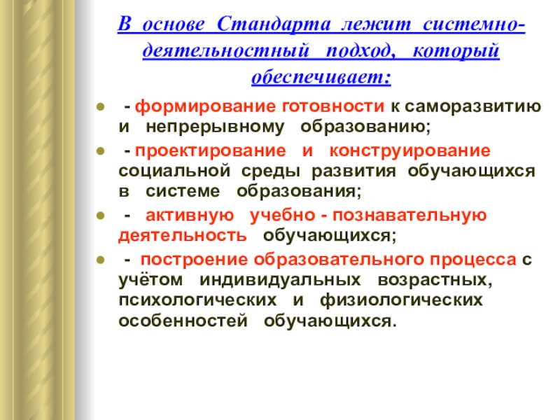 Слайд 5В основе Стандарта лежит системно-деятельностный подход, который обеспечивает: