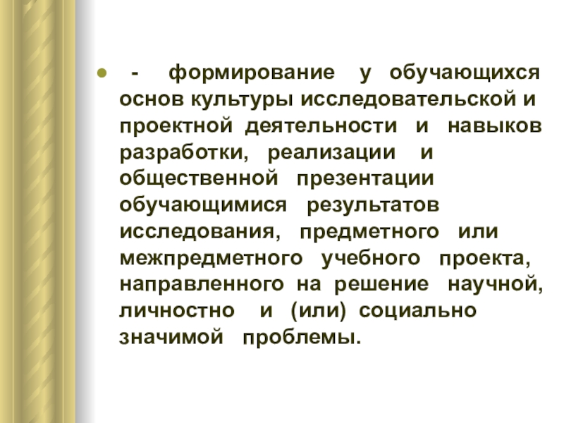 исследовательской и проектной деятельности и навыков разработки, реализации и общественной презентации обучающимися результатов исследования, предметного или межпредметного учебного проекта, направленного на решение научной, личностно и (или) социально значимой проблемы.