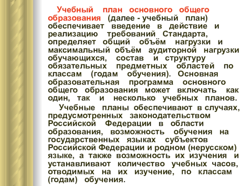 образования (далее - учебный план) обеспечивает введение в действие и реализацию требований Стандарта, определяет общий объём нагрузки и максимальный объём аудиторной нагрузки обучающихся, состав и структуру обязательных предметных областей по классам (годам обучения). Основная образовательная программа основного общего образования может включать как один, так и несколько учебных планов.