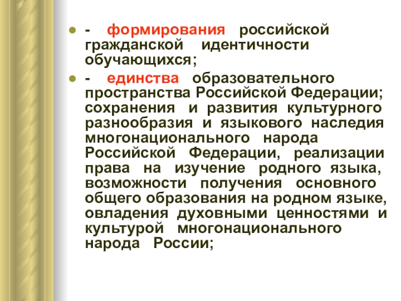 образовательного пространства Российской Федерации; сохранения и развития культурного разнообразия и языкового наследия многонационального народа Российской Федерации, реализации права на изучение родного языка, возможности получения основного общего образования на родном языке, овладения духовными ценностями и культурой многонационального народа России;