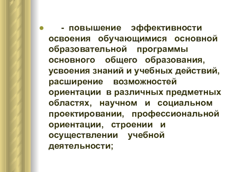 основной образовательной программы основного общего образования, усвоения знаний и учебных действий, расширение возможностей ориентации в различных предметных областях, научном и социальном проектировании, профессиональной ориентации, строении и осуществлении учебной деятельности;