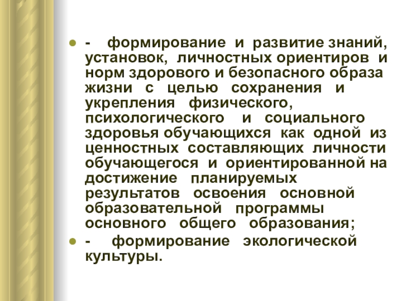 здорового и безопасного образа жизни с целью сохранения и укрепления физического, психологического и социального здоровья обучающихся как одной из ценностных составляющих личности обучающегося и ориентированной на достижение планируемых результатов освоения основной образовательной программы основного общего образования;