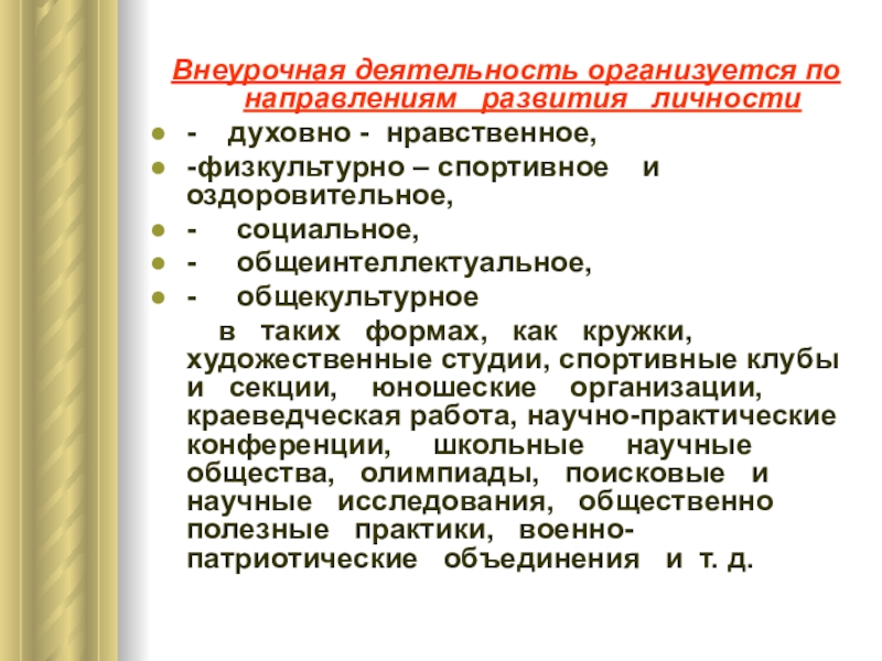 в таких формах, как кружки, художественные студии, спортивные клубы и секции, юношеские организации, краеведческая работа, научно-практические конференции, школьные научные общества, олимпиады, поисковые и научные исследования, общественно полезные практики, военно-патриотические объединения и т. д.