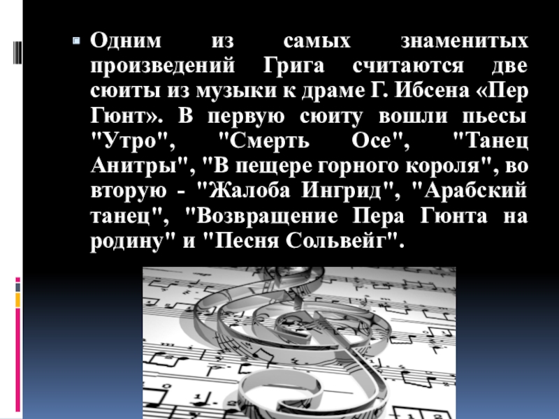 Одним из самых знаменитых произведений Грига считаются две сюиты из музыки к драме Г. Ибсена «Пер Гюнт».