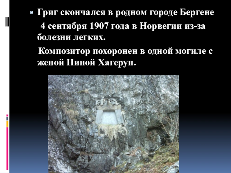 Григ скончался в родном городе Бергене     4 сентября 1907 года в Норвегии из-за болезни легких.   Композитор похоронен в