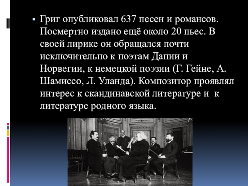 Слайд 10Григ опубликовал 637 песен и романсов. Посмертно издано ещё около 20 пьес.