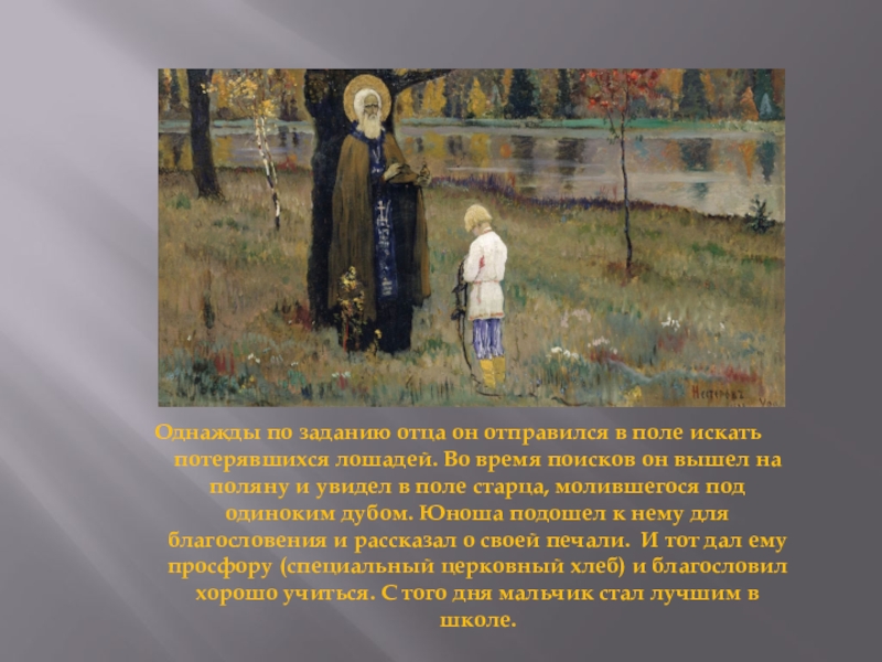 Во время поисков он вышел на поляну и увидел в поле старца, молившегося под одиноким дубом. Юноша подошел к нему для благословения и рассказал о своей печали. И тот дал ему просфору (специальный церковный хлеб) и благословил хорошо учиться. С того дня мальчик стал лучшим в школе.