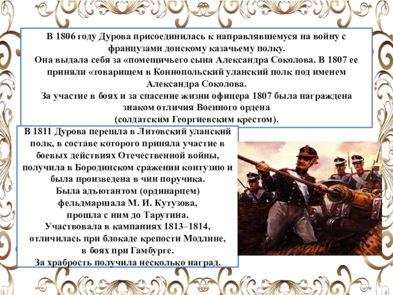 В 1811 Дурова перешла в Литовский уланский полк, в составе которого приняла участие в боевых действиях Отечественной войны, получила в Бородинском сражении контузию и была произведена в чин поручика.