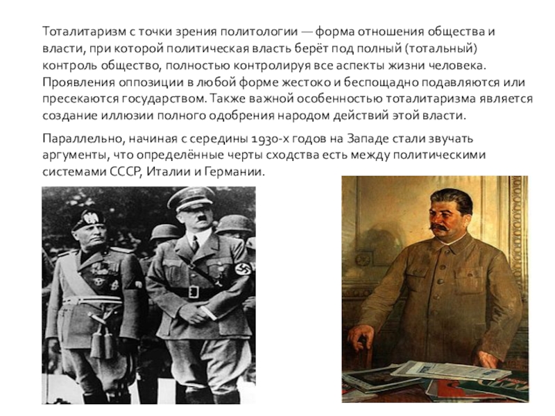 Параллельно, начиная с середины 1930-х годов на Западе стали звучать аргументы, что определённые черты сходства есть между политическими системами СССР, Италии и Германии.