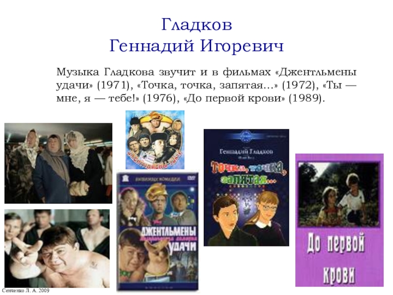 Музыка Гладкова звучит и в фильмах «Джентльмены удачи» (1971), «Точка,