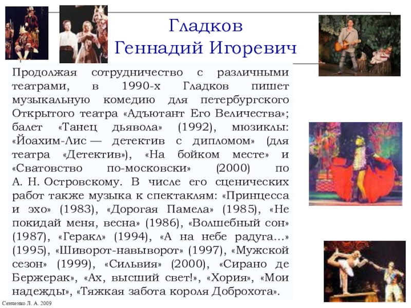 Продолжая сотрудничество с различными театрами, в 1990-х Гладков пишет музыкальную