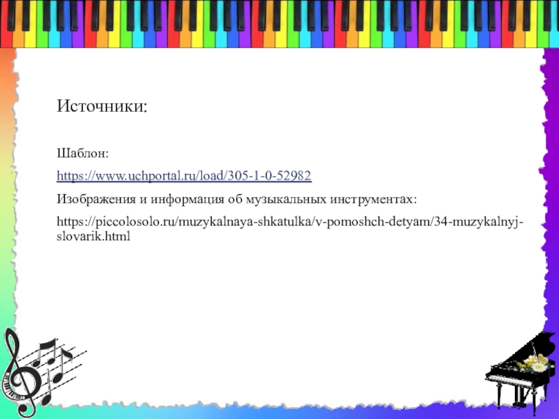 Источники: Шаблон:https://www.uchportal.ru/load/305-1-0-52982Изображения и информация об музыкальных инструментах:https://piccolosolo.ru/muzykalnaya-shkatulka/v-pomoshch-detyam/34-muzykalnyj-slovarik.html