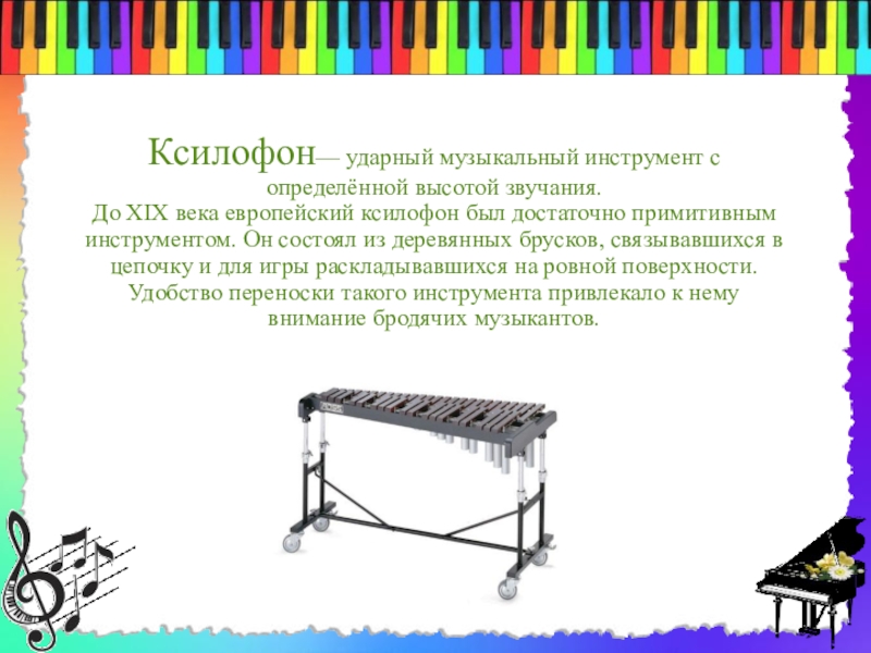Слайд 4Ксилофон— ударный музыкальный инструмент с определённой высотой звучания. До XIX века европейский