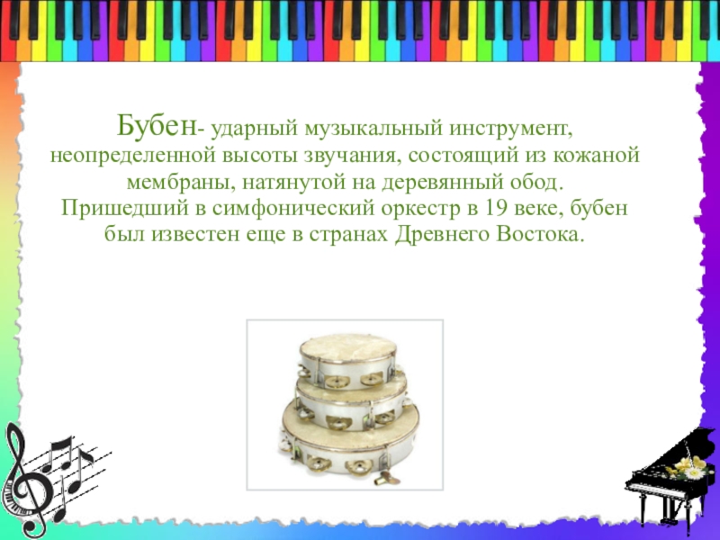 натянутой на деревянный обод. Пришедший в симфонический оркестр в 19 веке, бубен был известен еще в странах Древнего Востока.