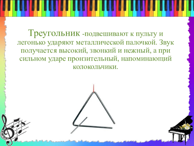 Слайд 8Треугольник -подвешивают к пульту и легонько ударяют металлической палочкой. Звук получается
