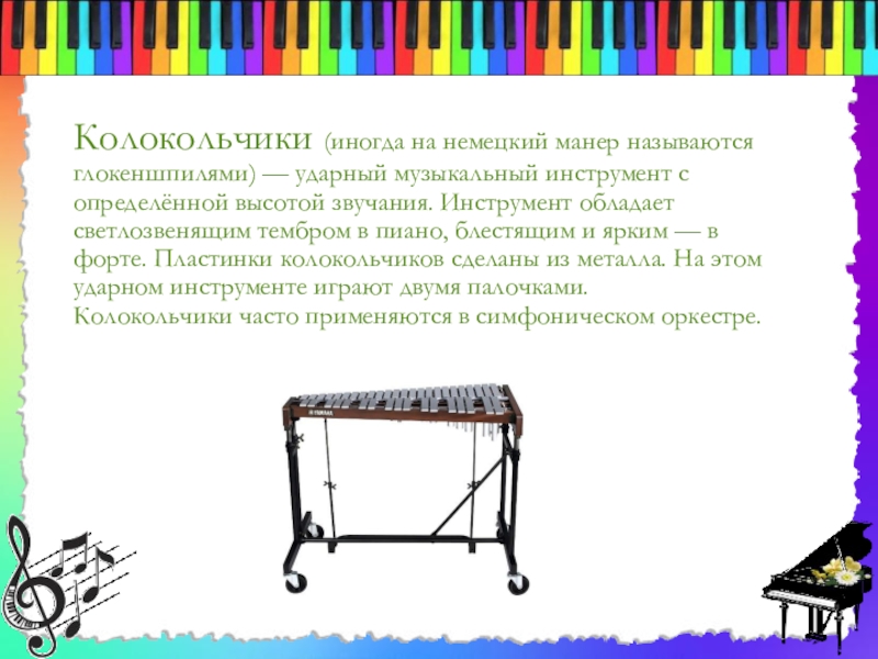 Слайд 3Колокольчики (иногда на немецкий манер называются глокеншпилями) — ударный музыкальный инструмент