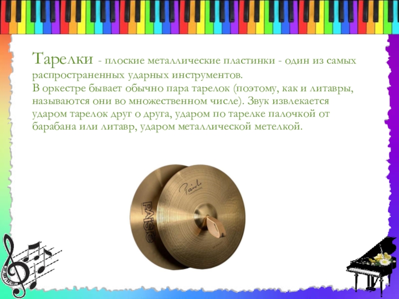 Слайд 5Тарелки - плоские металлические пластинки - один из самых распространенных ударных