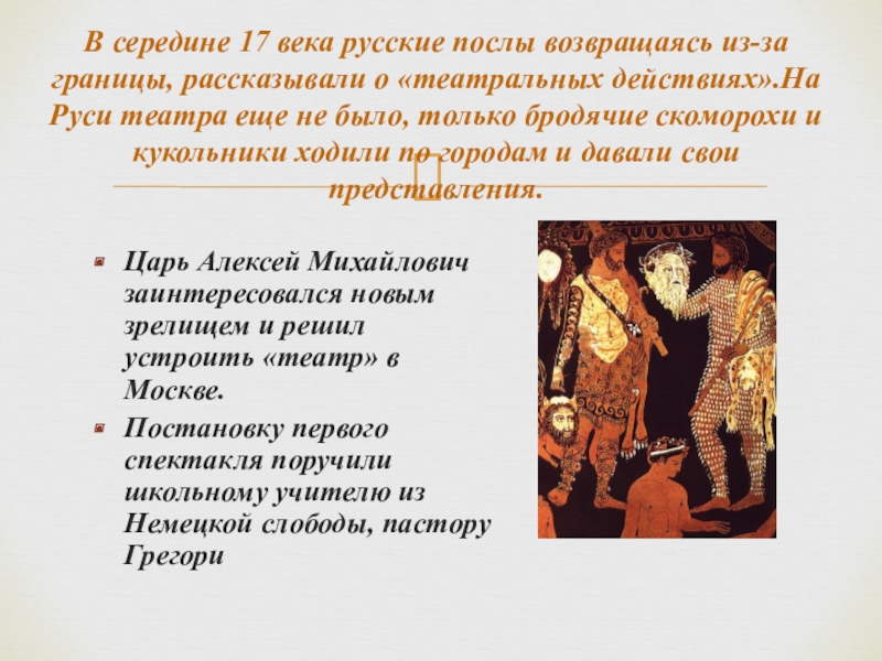 Царь Алексей Михайлович заинтересовался новым зрелищем и решил устроить «театр» в Москве.