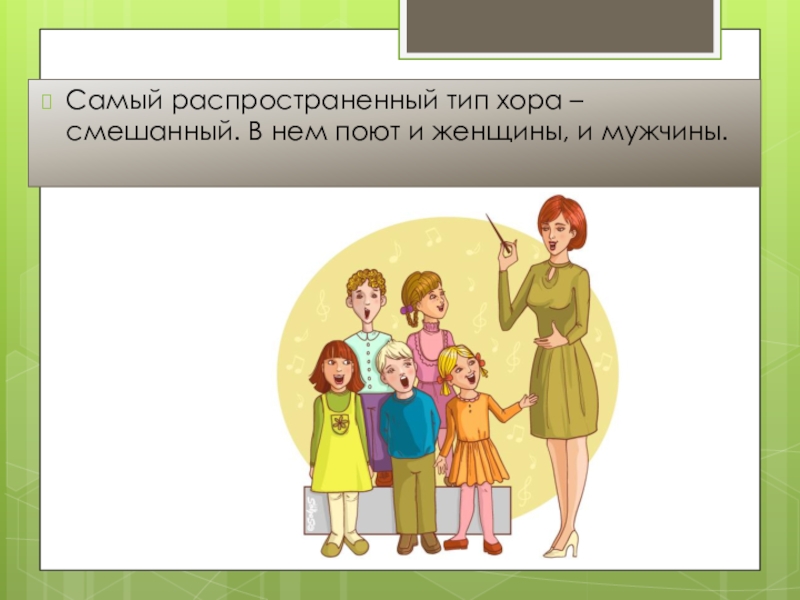 Слайд 6Самый распространенный тип хора – смешанный. В нем поют и женщины,