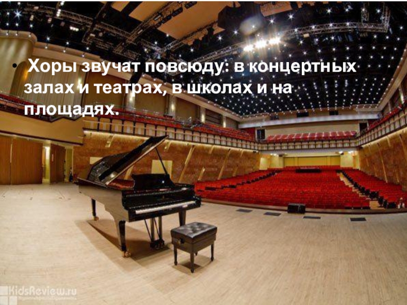Слайд 4 Хоры звучат повсюду: в концертных залах и театрах, в школах