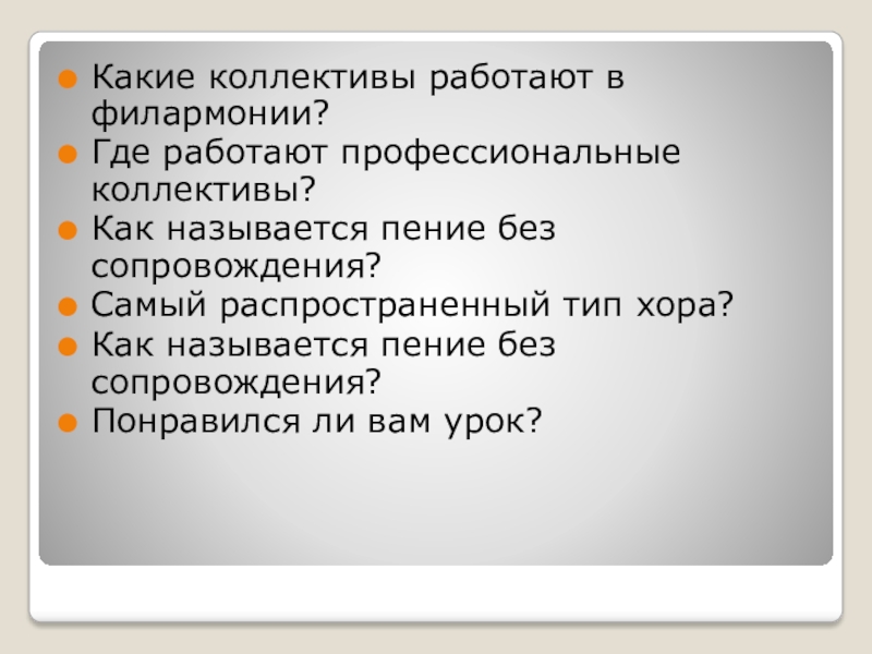 Какие коллективы работают в филармонии?Где работают профессиональные коллективы?Как называется пение без сопровождения?Самый распространенный тип хора?Как называется пение