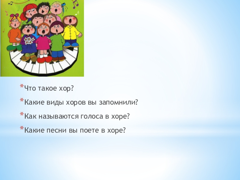 Что такое хор?Какие виды хоров вы запомнили?Как называются голоса в хоре?Какие песни вы поете в хоре?