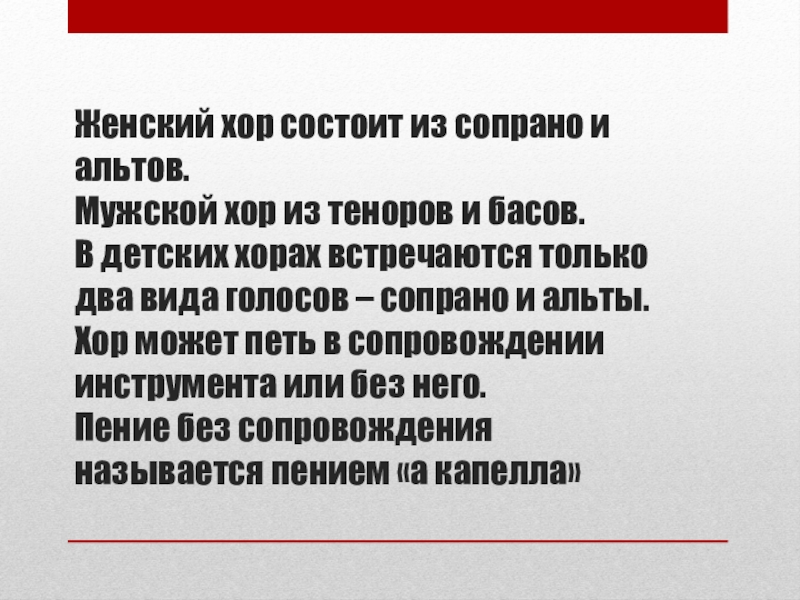 и басов. В детских хорах встречаются только два вида голосов – сопрано и альты. Хор может петь в сопровождении инструмента или без него. Пение без сопровождения называется пением «а капелла»