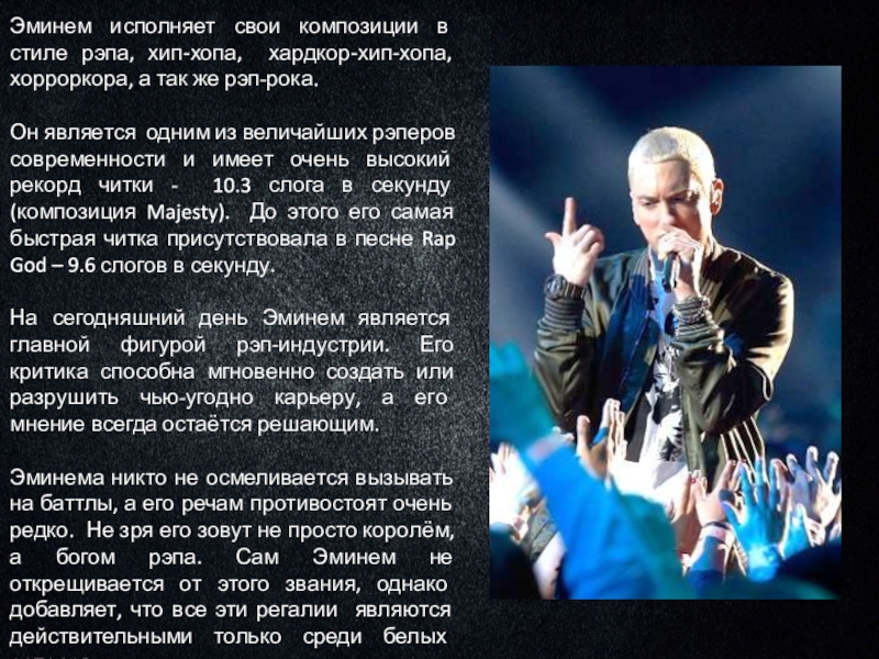 Слайд 8Эминем исполняет свои композиции в стиле рэпа, хип-хопа, хардкор-хип-хопа, хорроркора, а