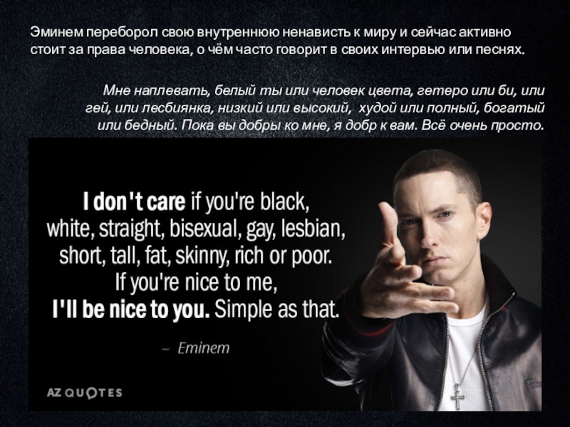 Слайд 10Эминем переборол свою внутреннюю ненависть к миру и сейчас активно стоит