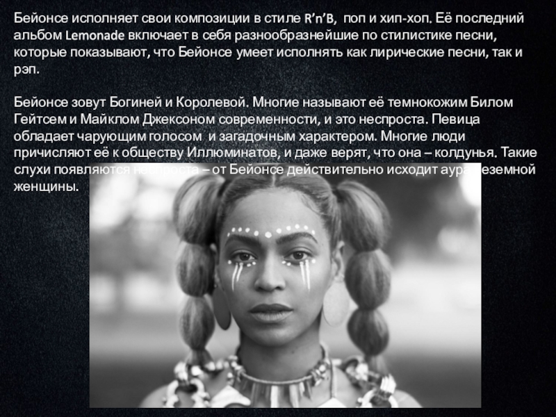 Слайд 21Бейонсе исполняет свои композиции в стиле R’n’B, поп и хип-хоп. Её