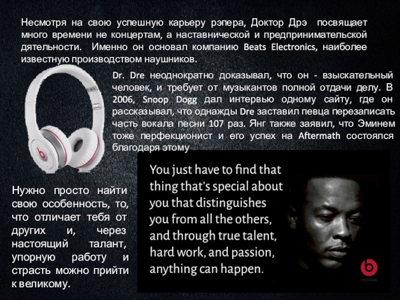 Слайд 14Несмотря на свою успешную карьеру рэпера, Доктор Дрэ посвящает много времени