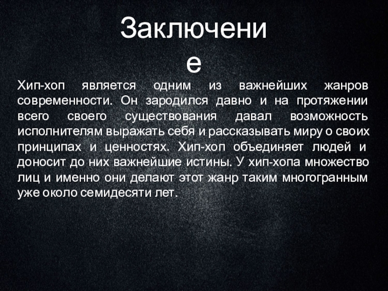 на протяжении всего своего существования давал возможность исполнителям выражать себя и рассказывать миру о своих принципах и ценностях. Хип-хоп объединяет людей и доносит до них важнейшие истины. У хип-хопа множество лиц и именно они делают этот жанр таким многогранным уже около семидесяти лет.