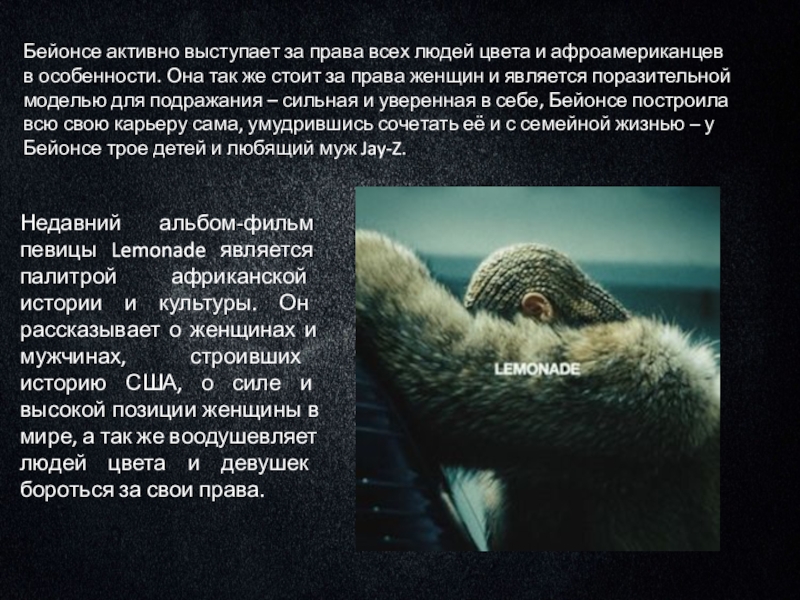 Недавний альбом-фильм певицы Lemonade является палитрой африканской истории и культуры. Он рассказывает о женщинах и мужчинах, строивших историю США, о силе и высокой позиции женщины в мире, а так же воодушевляет людей цвета и девушек бороться за свои права.