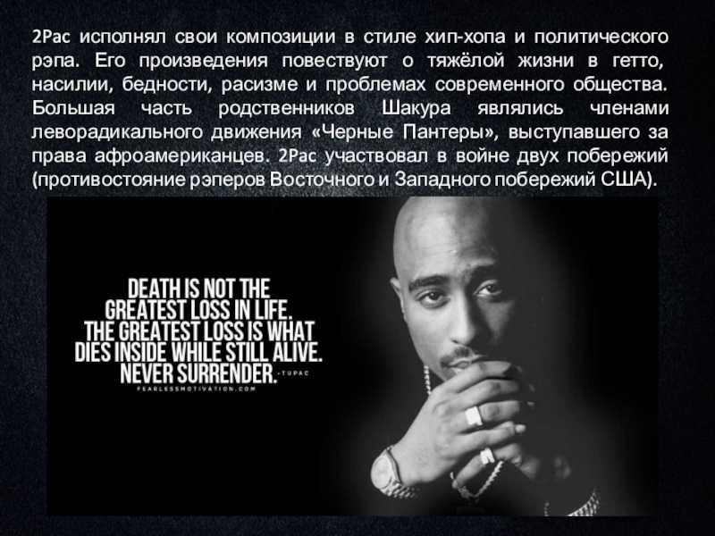 Слайд 182Pac исполнял свои композиции в стиле хип-хопа и политического рэпа. Его