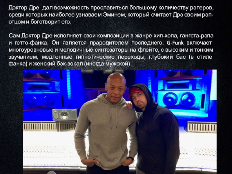Слайд 13Доктор Дре дал возможность прославиться большому количеству рэперов, среди которых наиболее