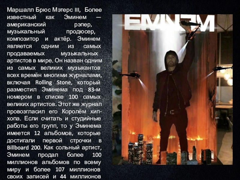 музыкальный продюсер, композитор и актёр. Эминем является одним из самых продаваемых музыкальных артистов в мире. Он назван одним из самых великих музыкантов всех времён многими журналами, включая Rolling Stone, который разместил Эминема под 83-м номером в списке 100 самых великих артистов. Этот же журнал провозгласил его Королём хип-хопа. Если считать и студийные работы его групп, то у Эминема имеется 12 альбомов, которые достигали первой строчки в Billboard 200. Как сольный артист, Эминем продал более 100 миллионов альбомов по всему миру и более 107 миллионов своих записей и 44 миллионов копий своих альбомов только в Америке.