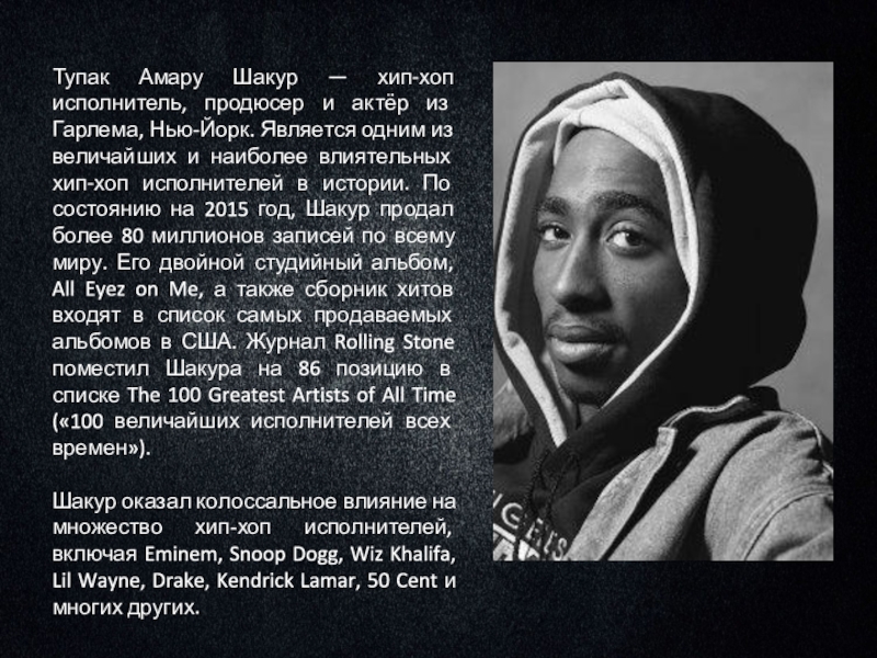 Слайд 16Тупак Амару Шакур — хип-хоп исполнитель, продюсер и актёр из Гарлема,