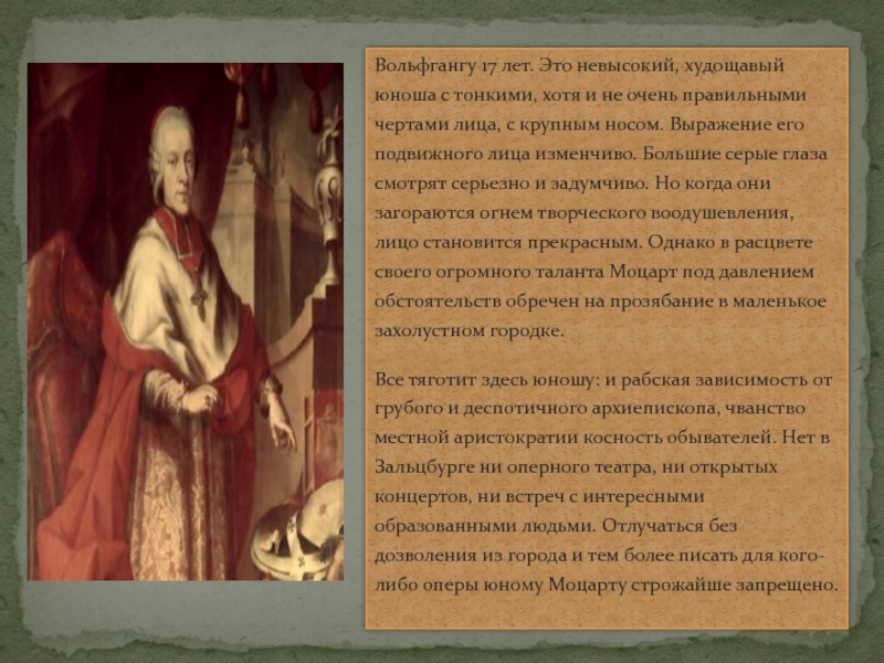 не очень правильными чертами лица, с крупным носом. Выражение его подвижного лица изменчиво. Большие серые глаза смотрят серьезно и задумчиво. Но когда они загораются огнем творческого воодушевления, лицо становится прекрасным. Однако в расцвете своего огромного таланта Моцарт под давлением обстоятельств обречен на прозябание в маленькое захолустном городке.