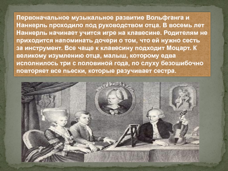 Слайд 4Первоначальное музыкальное развитие Вольфганга и Наннерль проходило под руководством отца. В