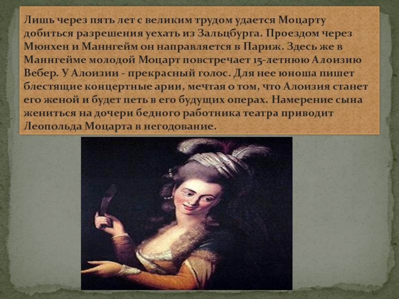 уехать из Зальцбурга. Проездом через Мюнхен и Маннгейм он направляется в Париж. Здесь же в Маннгейме молодой Моцарт повстречает 15-летнюю Алоизию Вебер. У Алоизии - прекрасный голос. Для нее юноша пишет блестящие концертные арии, мечтая о том, что Алоизия станет его женой и будет петь в его будущих операх. Намерение сына жениться на дочери бедного работника театра приводит Леопольда Моцарта в негодование.