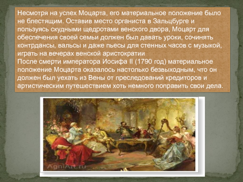 Слайд 12Несмотря на успех Моцарта, его материальное положение было не блестящим. Оставив