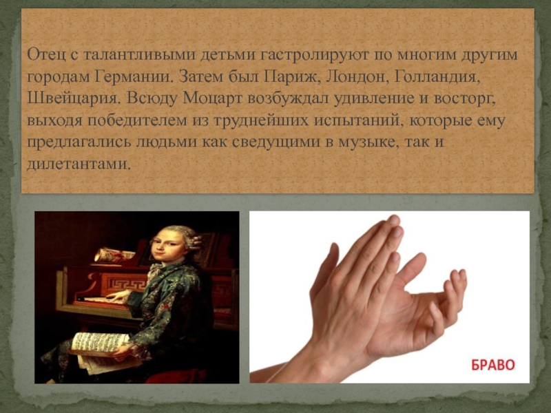 был Париж, Лондон, Голландия, Швейцария. Всюду Моцарт возбуждал удивление и восторг, выходя победителем из труднейших испытаний, которые ему предлагались людьми как сведущими в музыке, так и дилетантами.