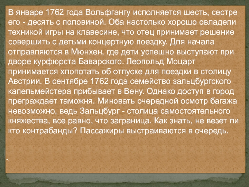 с половиной. Оба настолько хорошо овладели техникой игры на клавесине, что отец принимает решение совершить с детьми концертную поездку. Для начала отправляются в Мюнхен, где дети успешно выступают при дворе курфюрста Баварского. Леопольд Моцарт принимается хлопотать об отпуске для поездки в столицу Австрии. В сентябре 1762 года семейство зальцбургского капельмейстера прибывает в Вену. Однако доступ в город преграждает таможня. Миновать очередной осмотр багажа невозможно, ведь Зальцбург - столица самостоятельного княжества, все равно, что заграница. Как знать, не везет ли кто контрабанды? Пассажиры выстраиваются в очередь.