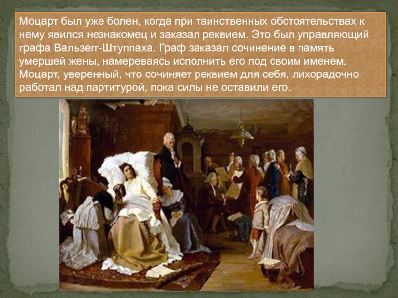 Слайд 14Моцарт был уже болен, когда при таинственных обстоятельствах к нему явился