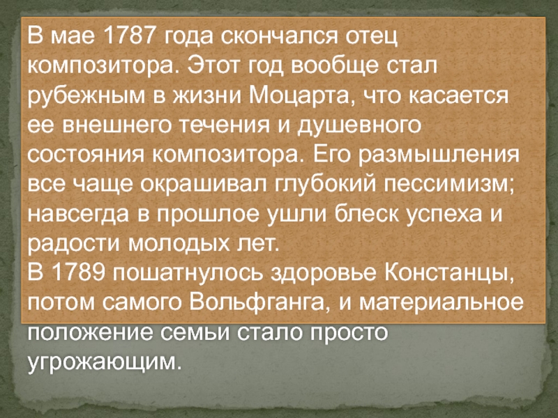 Слайд 13В мае 1787 года скончался отец композитора. Этот год вообще стал