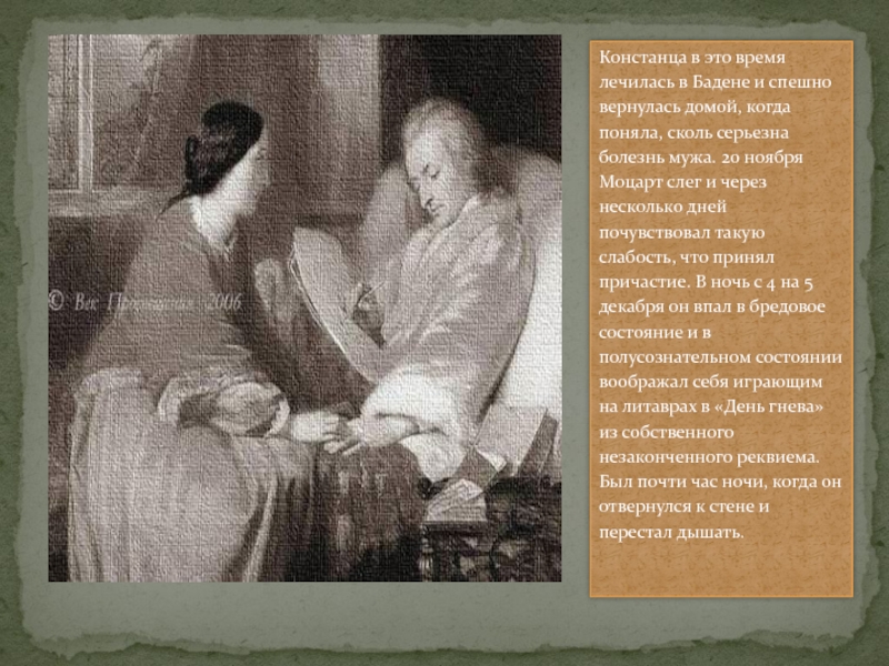 когда поняла, сколь серьезна болезнь мужа. 20 ноября Моцарт слег и через несколько дней почувствовал такую слабость, что принял причастие. В ночь с 4 на 5 декабря он впал в бредовое состояние и в полусознательном состоянии воображал себя играющим на литаврах в «День гнева» из собственного незаконченного реквиема. Был почти час ночи, когда он отвернулся к стене и перестал дышать.