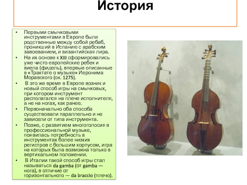 На их основе к XIII сформировались уже чисто европейские ребек и виела (фидель), впервые описанные в «Трактате о музыке» Иеронима Моравского (ок. 1275).