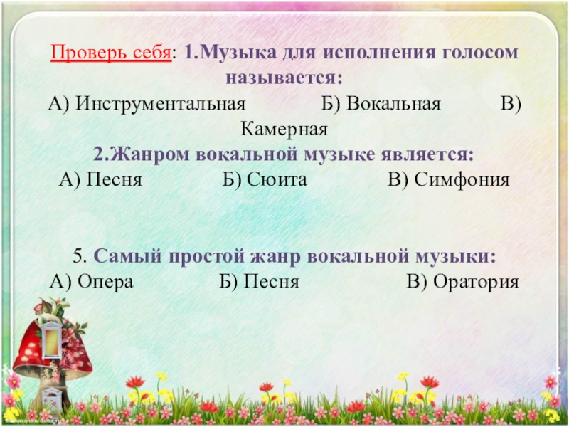Проверь себя: 1.Музыка для исполнения голосом называется: А) Инструментальная              Б) Вокальная